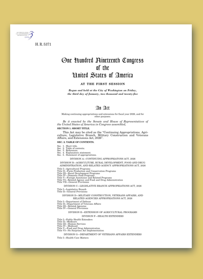 H.R. 5371 (ENR) – Continuing Appropriations, Agriculture, Legislative Branch, Military Construction and Veterans Affairs, and Extensions Act, 2026, is now available on GovInfo.