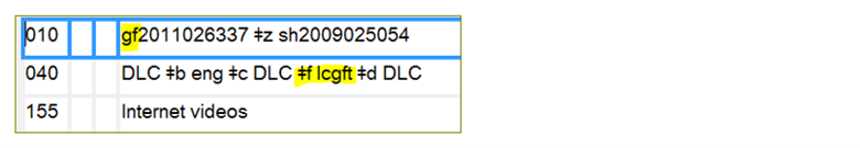 • Tip: In OCLC Connexion, enter the term alone in a field coded 655 #7. Then, simply control the heading, and OCLC will supply ǂ2 lcgft.